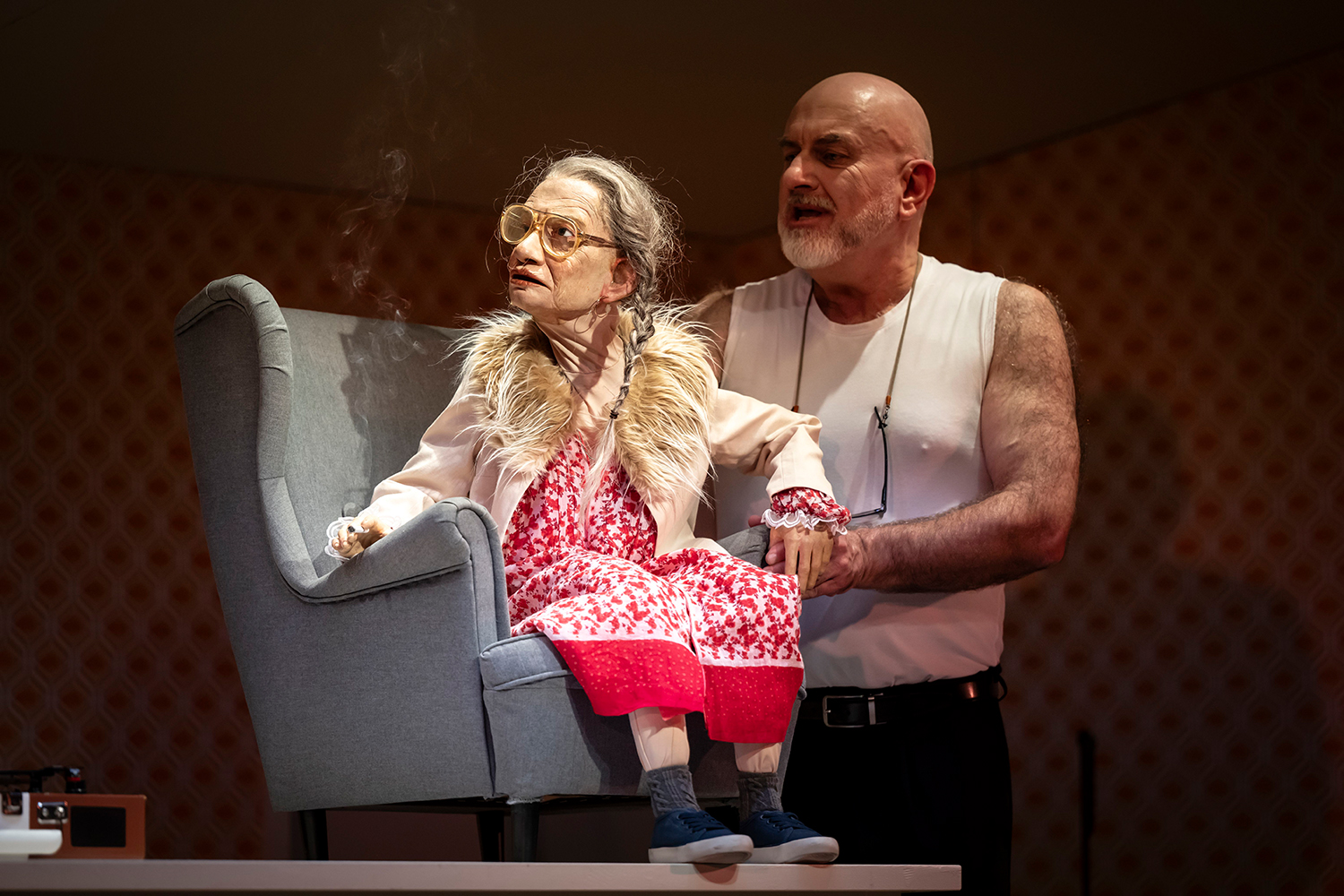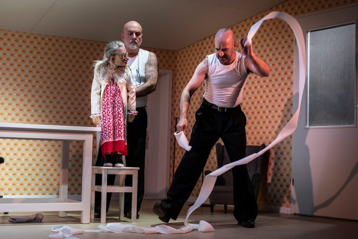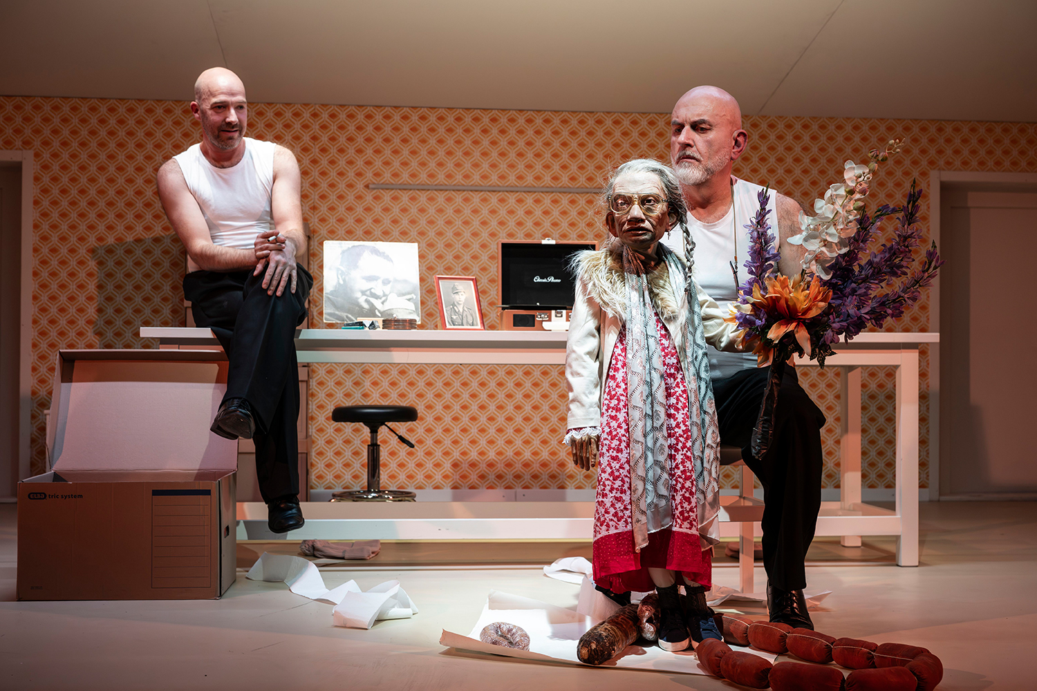 In Sostmanns Inszenierung interagieren Menschen mit Puppen und erwecken – als Pflegende, Angehörige, Freunde – die Porträts der Bewohner*innen zum Leben. So wird das Pflegezimmer zum Modell der Welt: Wer sind wir, und was bleibt von uns zurück, wenn wir uns selbst vergessen?
