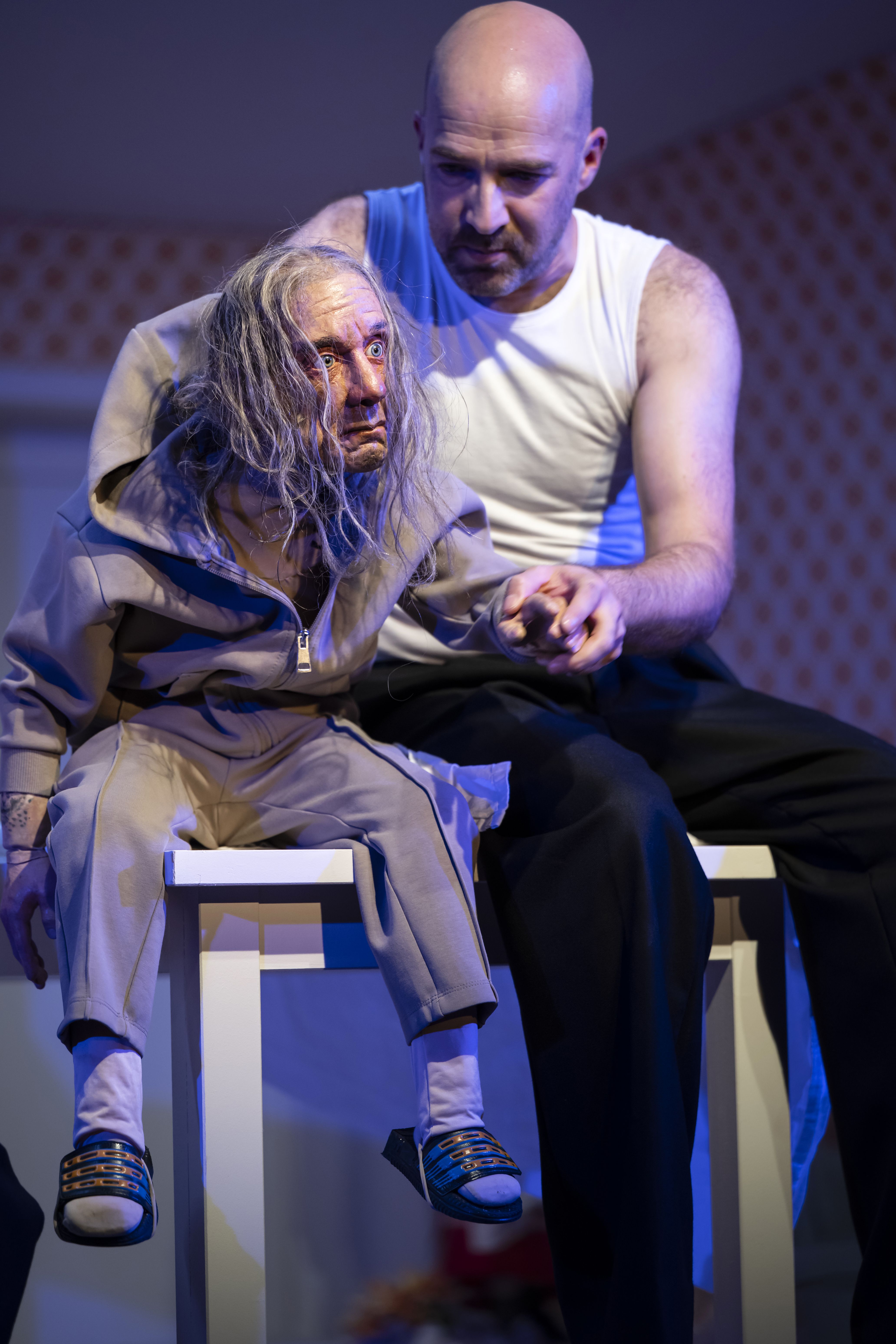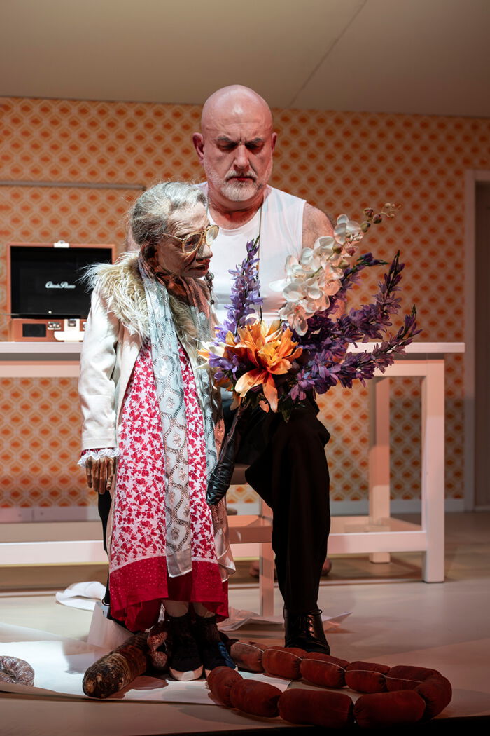 In Sostmanns Inszenierung interagieren Menschen mit Puppen und erwecken – als Pflegende, Angehörige, Freunde – die Porträts der Bewohner*innen zum Leben. So wird das Pflegezimmer zum Modell der Welt: Wer sind wir, und was bleibt von uns zurück, wenn wir uns selbst vergessen?